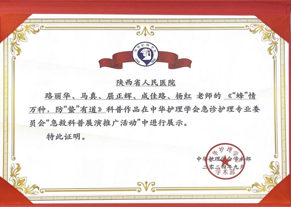 接到展演推广活动通知后,六合彩网站组织急救应急中心护士长讨论,从选题到脚本的撰写,反复修改,层层选拔,最终确定由急诊内科路丽华、屈正辉、杨红,急诊外科马真、成佳路五名队员组队参赛。赛前护理部副主任刘晓梅、急诊内科刘丹平主任、急诊外科马龙洋副主任多次现场指导,护理部也邀请了院内多名护理专家点评。经过精心准备与刻苦训练,六合彩网站以《“蜂”情万种,防蛰有道》为题,在陕西省护理学会举办的遴选活动中荣获第一名,被推荐代表陕西省参加全国急救科普展演推广活动。