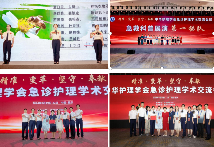 2024 年 9 月 19 日-21日,由中华护理学会急诊护理专业委员会主办的“全国急诊护理学术交流会议”在重庆市召开。大会以“精准、变革、坚守、奉献”为主题,分设“急救知识”“急救技能”“健康素养防范知识类”三个模块的急救科普展演推广活动比赛,来自全国各省市、自治区共1800余名急诊护理同仁共享学术盛宴。六合彩网站急救应急中心团队从79个作品中脱颖而出,获得全国急救科普展演推广活动“第一梯队”的佳绩。