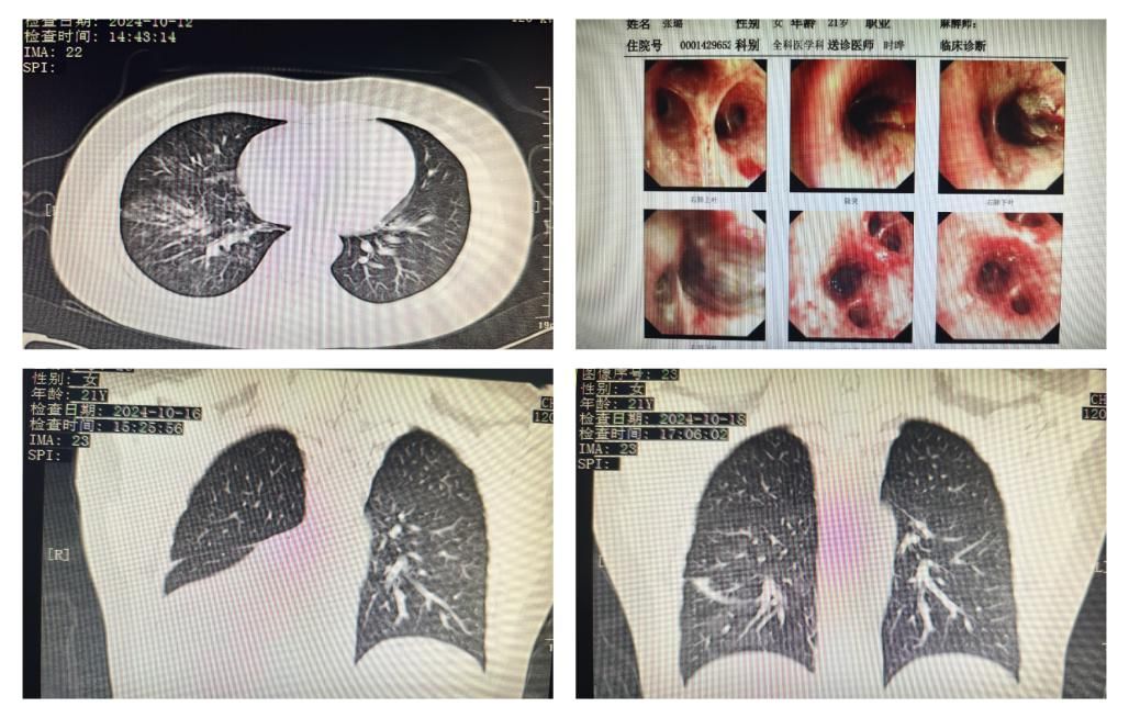 次日,在时晔主任及雷鸣主管医生陪同下,陈瑞琳主任医师进行支气管镜检查,发现患者右肺下叶管口条索状异物,完全阻塞右肺下叶支气管,活检时发现异物质软,且与气道壁嵌合,反复使用活检钳及异物篮均不能顺利取出。患者因治疗时间长剧烈咳嗽、不耐受治疗,随急诊请胸外科戴云副主任医师、麻醉科徐瑞芬主任医师到支气管室会诊配合,经过液氮冷冻、网篮及反复抽吸后,取出数条支气管树状异物,似为牛油果泥与凝血块混合物,此时右肺下叶管腔完全通畅。术后次日复查胸部CT,患者右下肺不张明显改善,继续药物抗感染止血等治疗,患者病情好转,未再咳血,双肺呼吸音正常,血氧饱和度99%,于10月21日顺利出院。
