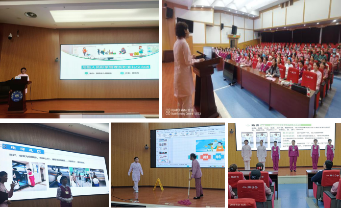 为贯彻落实医院“强作风,重团结,优服务,抓落实,促发展”工作要求,提升后勤服务中心员工的整体素质与工作能力,10月24日下午,后勤服务中心保洁部结合后勤部门大练兵活动,在前期开展保洁人员院感专题培训的基础上,针对保洁员及电梯员在日常工作中发现的短板弱项,针对性地再次组织开展“后勤服务中心员工形象管理及职业礼仪沟通”专题培训,全体电梯员及保洁人员参加。培训由保洁部负责人韩宇枫主持。