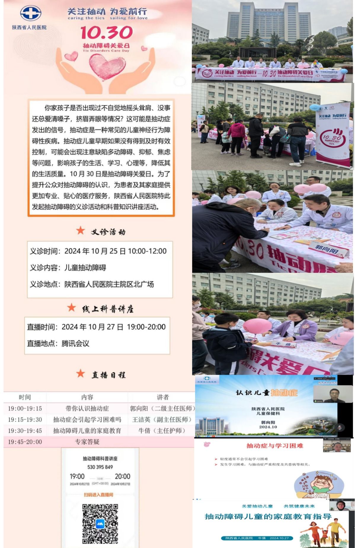 每年的10月30日是中国“抽动障碍关爱日”,今年的主题是“关注抽动,为爱前行”,旨在进一步科普抽动障碍知识,提升社会对抽动障碍的认识和理解。在“抽动障碍关爱日”来临之际,六合彩网站积极响应社会关切,儿童保健科联合儿科、延续服务中心开展了“关注抽动为爱前行”为主题的抽动障碍关爱日公益义诊宣传活动。