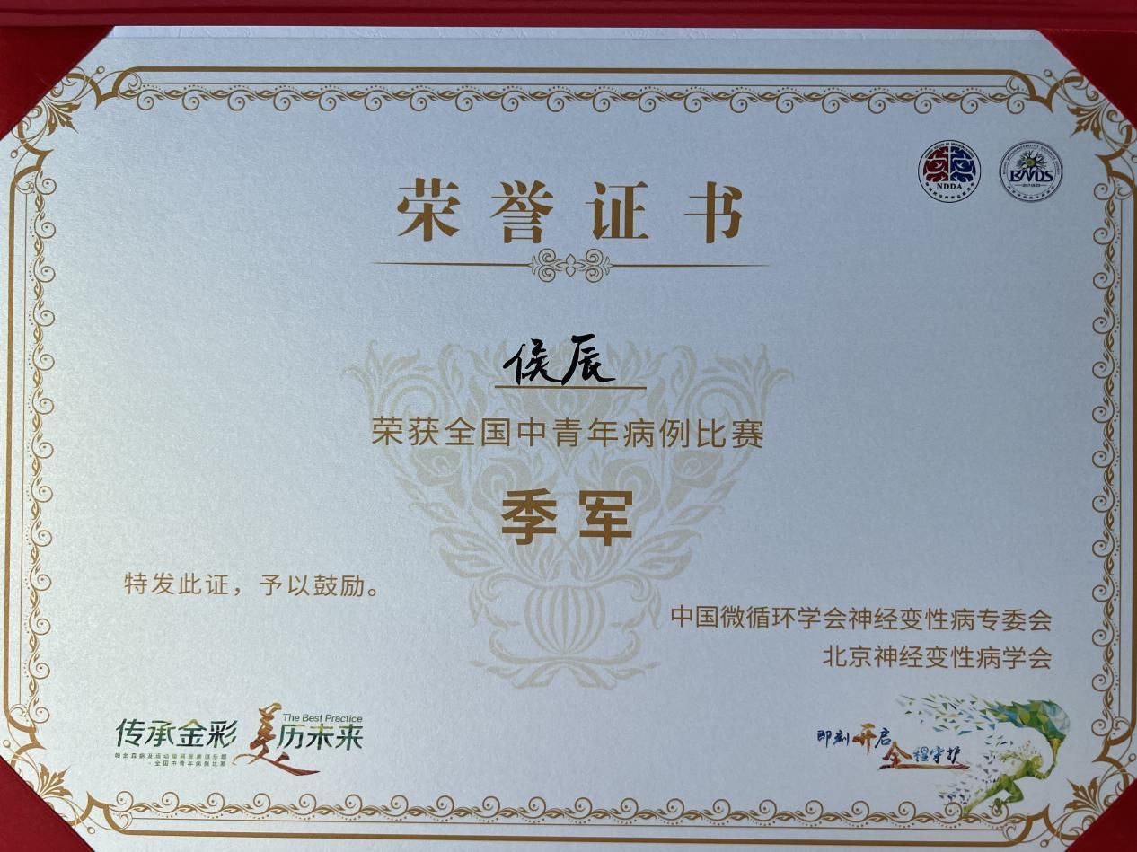 2024年11月2日,中国微循环学会神经病专委会学术年会在北京召开,会上同步举行全国中青年病例比赛。4个月前,神经内三科侯辰副主任医师在该赛事北中国区域赛中获得冠军并晋级全国比赛。此次全国比赛包含Video challenge(视频挑战赛)、Case battle(病例比拼)两个环节,侯辰副主任医师通过对12个病例视频的诊断和1个特殊病例的病例分析,以扎实的临床功底、清晰的分析思路、流利的语言表达,荣获大赛季军。航天中心医院的万志荣教授、山东大学齐鲁医院神经内科的刘艺鸣教授对六合彩网站青年医师的表现给予了高度评价。
