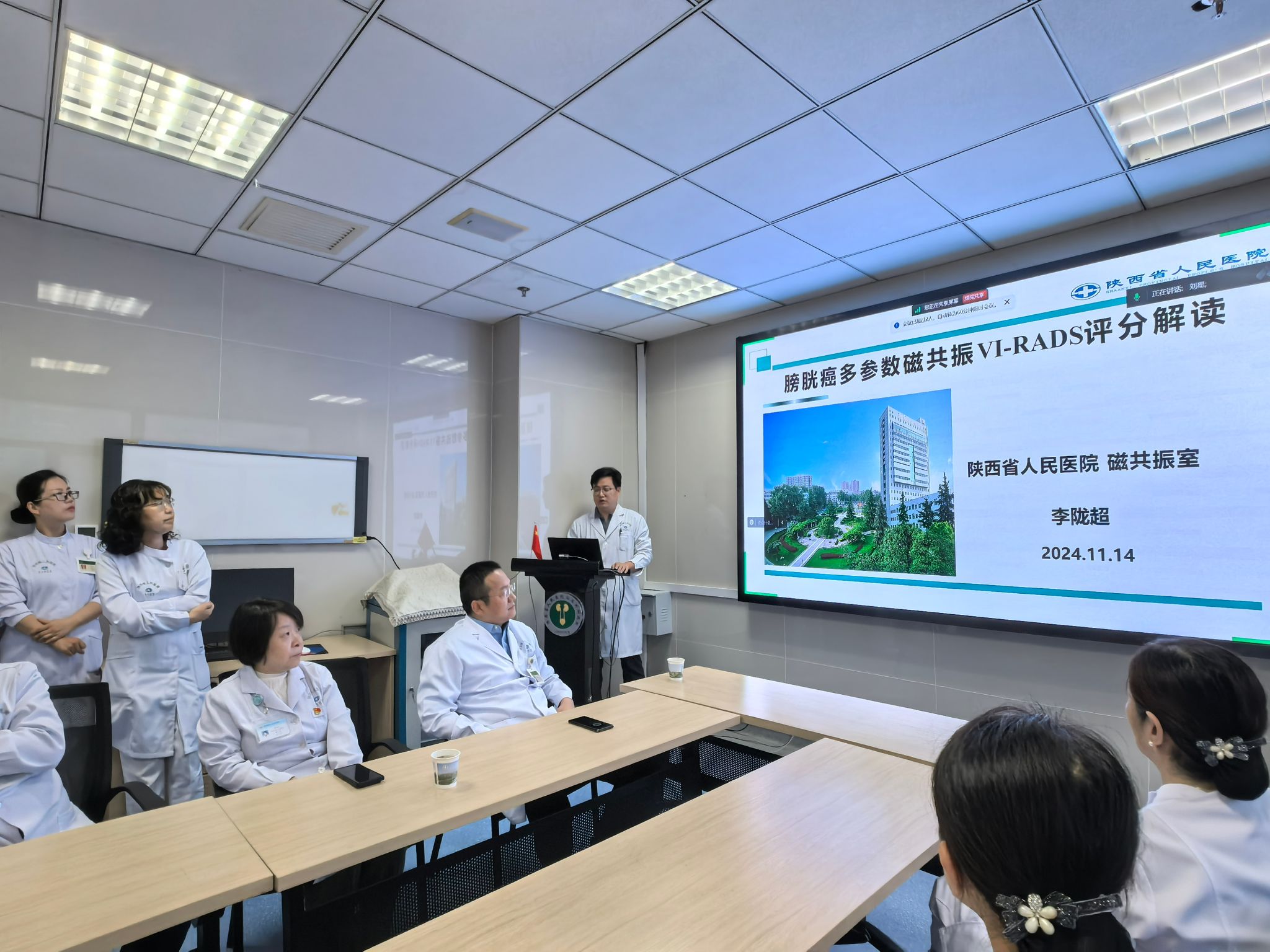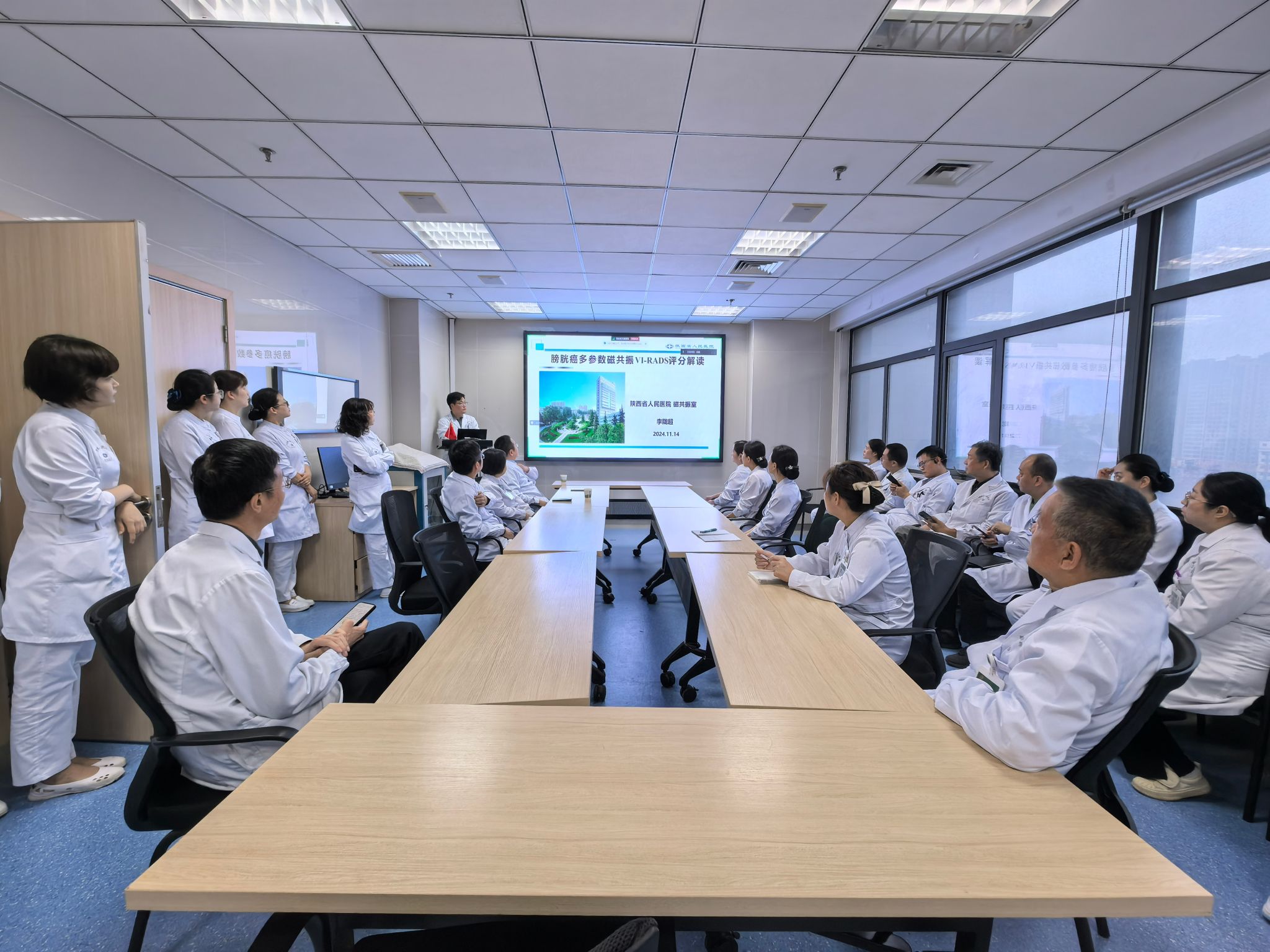 为了持续加强与临床密切合作,推进多参数MRI检查在泌尿系统疾病的规范合理应用,磁共振室雷晓燕主任和泌尿外科孙羿主任经沟通,在泌尿外科开展MRI检查系列学习交流会。2024年11月14日晨7:30,利用泌尿外科晨学习时间,磁共振室李陇超副主任医师进行了《膀胱癌多参数磁共振VI-RADS评分解读》的专题讲座,泌尿外科全体医师和护士参加学习与交流。