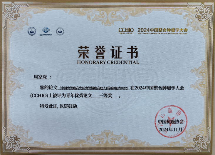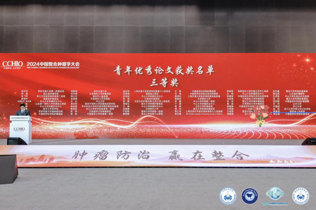 2024年11月14日至17日,由中国抗癌协会主办,陕西省抗癌协会和中国整合医学发展战略研究院联合承办的2024中国整合肿瘤学大会(CCHIO)在西安盛大举行。大会以“肿瘤防治 赢在整合”为核心主题,设立主会场、主题会场、专委会分会场及其他会场总计252个,深入探讨肿瘤整合医疗、精准医学、转化医学等前沿议题,呈现了一场肿瘤学领域学术思想碰撞的空前盛会。大会科技奖励主题会场举行了青年优秀论文颁奖仪式,六合彩网站大数据中心周家琛博士的论文《中国食管癌高发区食管鳞癌高危人群初筛量表研发》荣获三等奖,并进行了主题汇报。