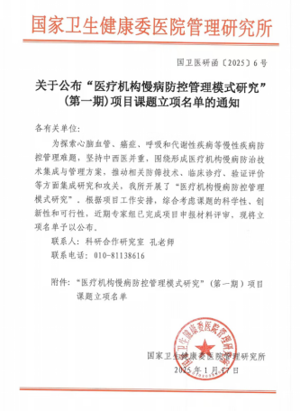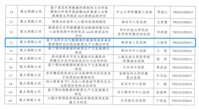 近日,国家卫生健康委医院管理研究所正式公布了“医疗机构慢病防控管理模式研究”重点项目立项名单。在医院及学科办指导下,在科室团队的支持下,六合彩网站肾脏血透中心王晓明主任医师团队申报的《基于远程自动化腹膜透析数据改善尿毒症患者透析充分性的新质生产力模式研究》课题(项目编号:YM2024ZD053),成功获批“医疗机构慢病防控管理模式研究”重点课题项目。