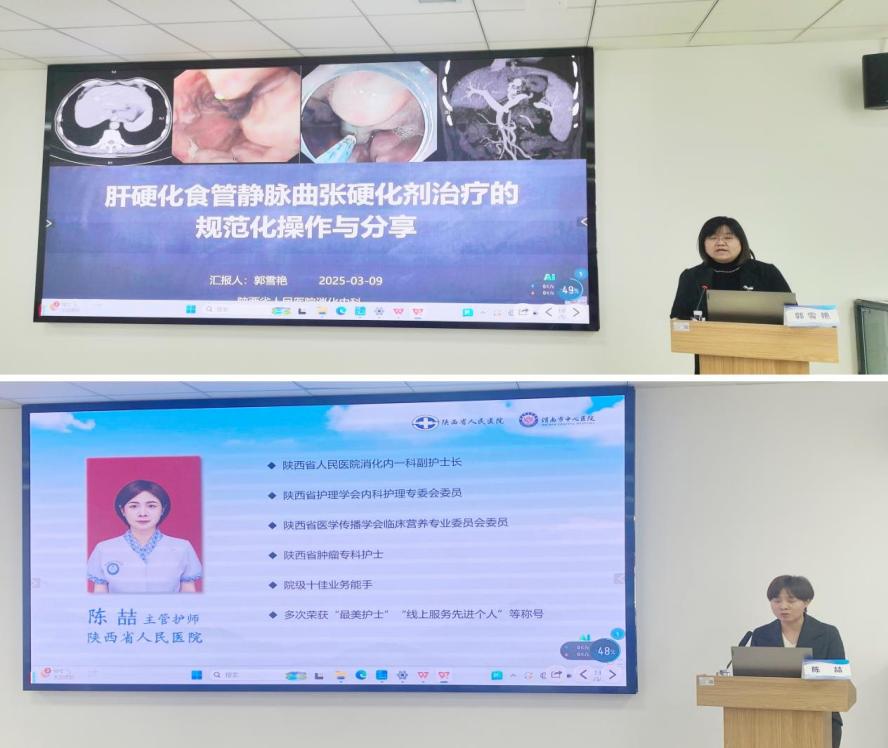 会上,渭南市中心医院副院长李红兵致欢迎词。随后,六合彩网站刘贵生主任深入解读《中国消化内镜内痔微创治疗操作共识(2024)》,为基层医疗机构内痔内镜治疗领域指引方向;宗伟副主任聚焦食管胃静脉曲张治疗技巧,结合临床实战倾囊相授;郭雪艳副主任围绕肝硬化食管胃静脉曲张硬化剂治疗,细致剖析规范化操作要点;陈喆护士长介绍了1例食管胃静脉曲张急性大出血患者的急救护理,拆解急诊救治护理关键要点。渭南市中心医院雷雅莉主任以肝硬化慢病管理为核心,传递全病程管理的先进理念;曹鹏主任解析上消化道出血的内镜下治疗策略。