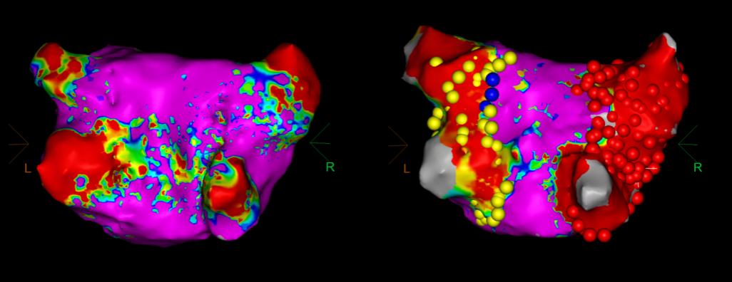 手术在介入导管室的通力配合下进行,姜馨主任、薛建颖主治医师、刘成峰医师密切配合,术中通过右侧股静脉送入心腔内超声(ICE)至右心房,排除左房血栓后成功指导精准房间隔穿刺,沿可调弯鞘管送入锦江心脏脉冲电场消融导管至左房,构建左房三维解剖模型并行基质标测,标测显示左房基质尚可,分别行左侧、右侧肺静脉消融。消融参数:1800v、400ms、400μs,共放电消融148次(消融左上肺静脉时转复为窦性心律),验证双肺静脉均隔离。术后重新标测显示所有肺静脉均已急性阻滞,消融效果理想,肺静脉前庭损伤范围也达到了预期的标准,同时ICE监测未见明显心包积液。手术仅用时30分钟,时间明显缩短,手术过程精准高效。术后患者恢复情况良好并顺利出院。术后1月复查心电图提示窦性心律,心脏超声提示心脏较前明显缩小,收缩功能明显改善,射血分数由25%提升至40%,心功能标记物NT-proBNP 恢复正常,仅54pg/ml。