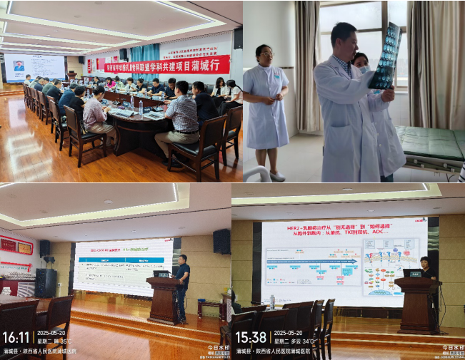 此次活动分为查房指导和学术交流两部分。在查房指导环节,肿瘤外科李建辉教授为病区乳腺肿瘤及甲状腺肿瘤患者进行了细致的查体,梳理患者病情、分析检查结果、指导治疗方案、给予最佳的诊疗建议,大大增强了患者和家属战胜疾病和困难的信心。学术交流会议由李建辉教授、蒲城县医院医务部部长、肿瘤外科赵刚主任和校智祥主任主持,县医院相关科室医护人员40余人参加。在会议中,肿瘤内科李东辉教授,肿瘤外科马刚博士分别就最新发布的CSCO2025乳腺癌诊疗指南中HER2阳性、激素受体阳性乳腺癌诊疗更新做了详尽解读。蒲城县医院肿瘤外科张维征副主任分享了一例HER2阳性晚期乳腺癌病例,在场专家展开了热烈讨论,提出了详细中肯的意见与建议。