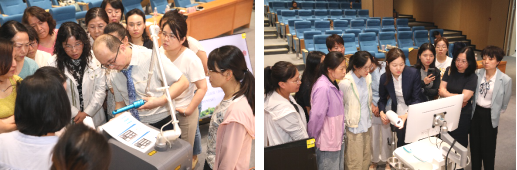 甘露副主任医师及孙晨阳主治医师现场示范阴道镜规范化标准化操作流程,学员逐一上手体验,专家实时纠错指导。姜向阳主任及吴艳芳主管护师模拟病例演示CO2激光治疗技巧,学员们紧盯屏幕记录要点,反复实操练习后逐渐掌握要领。张雅副主任医师和党群副主任医师进行阴道助产技术培训,以模型为教具,手把手传授产钳使用与体位调整技巧,学员们围成一圈认真观摩。脱军华主治医师通过情景模拟培训新生儿复苏急救步骤,学员分组演练,现场气氛紧张而有序。