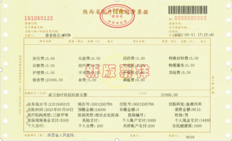 根据《陕西省财政厅、陕西省卫生健康委员会、陕西省医疗保障局关于启用医疗收费票据全国统一式样的通知》(陕财办综合【2022】11号)规定,六合彩网站从2023年4月4日起,启用全国统一样式的新版医疗住院收费票据,同时停用原版医疗住院收费票据。