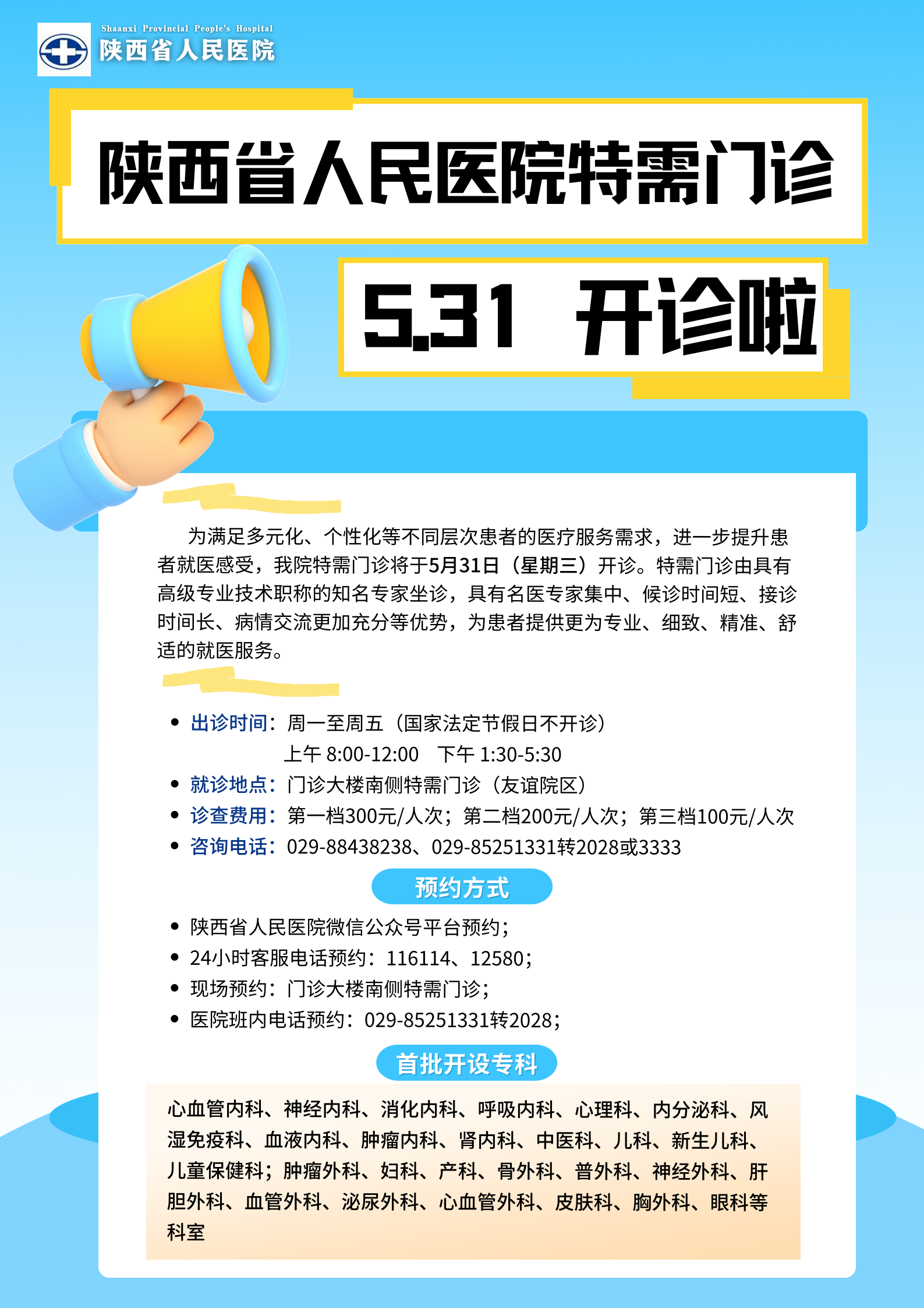 为满足多元化、个性化等不同层次患者的医疗服务需求,进一步提升患者就医感受,六合彩网站将于5月31日(星期三)开设特需门诊,由高年资专家团队出诊,一对一高品质服务,为您提供全新的就医体验。