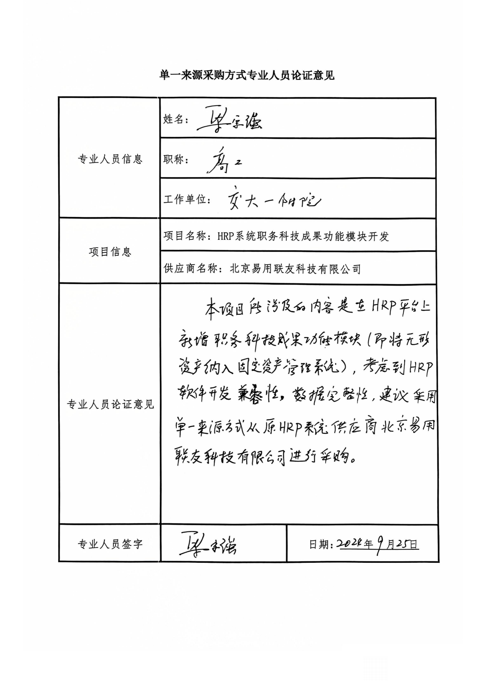 本项目设计的内容是在医院现有HRP平台上新增职务科技成果功能模块(即将无形资产纳入固定资产管理系统),考虑到HRP软件开发的兼容性,数据的完整性及与现有系统成熟应用的关联性,建议采用单一来源的方式从原HRP系统供应商采购。