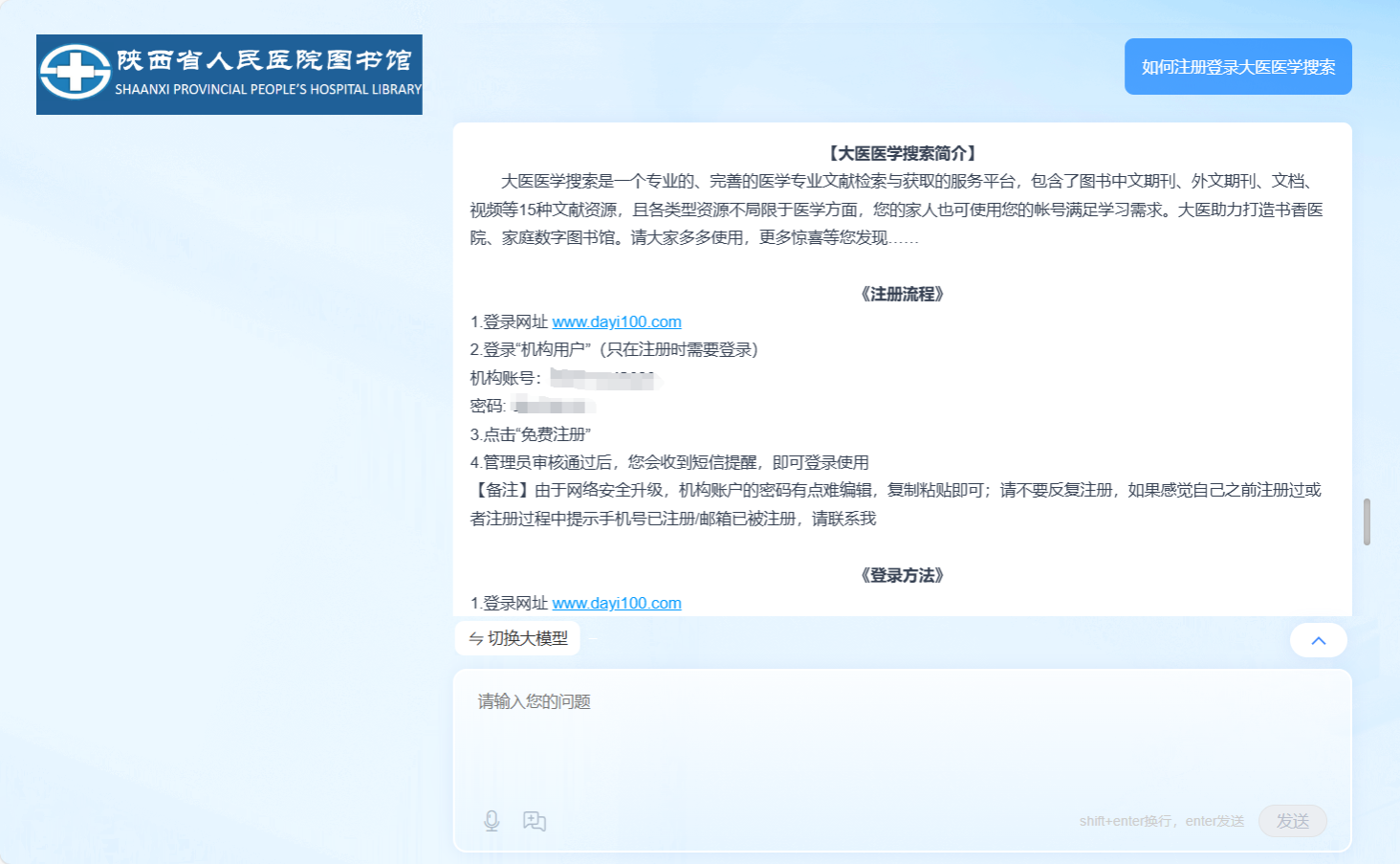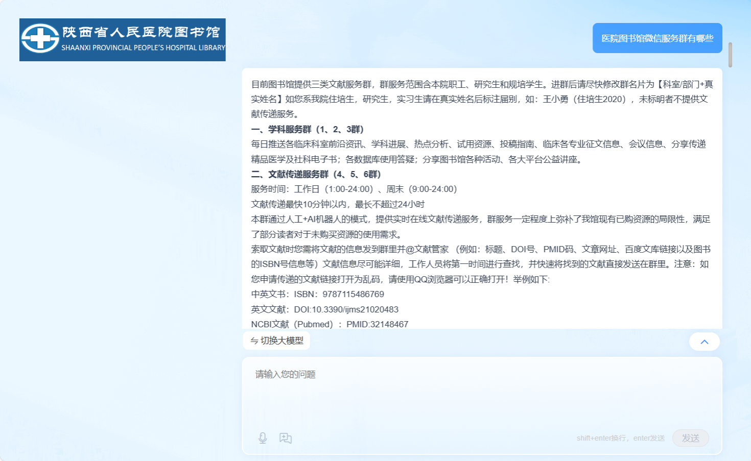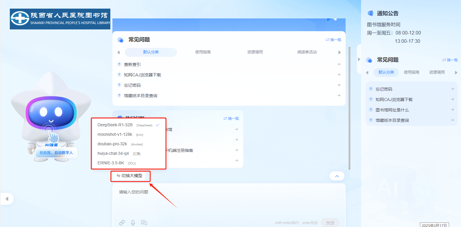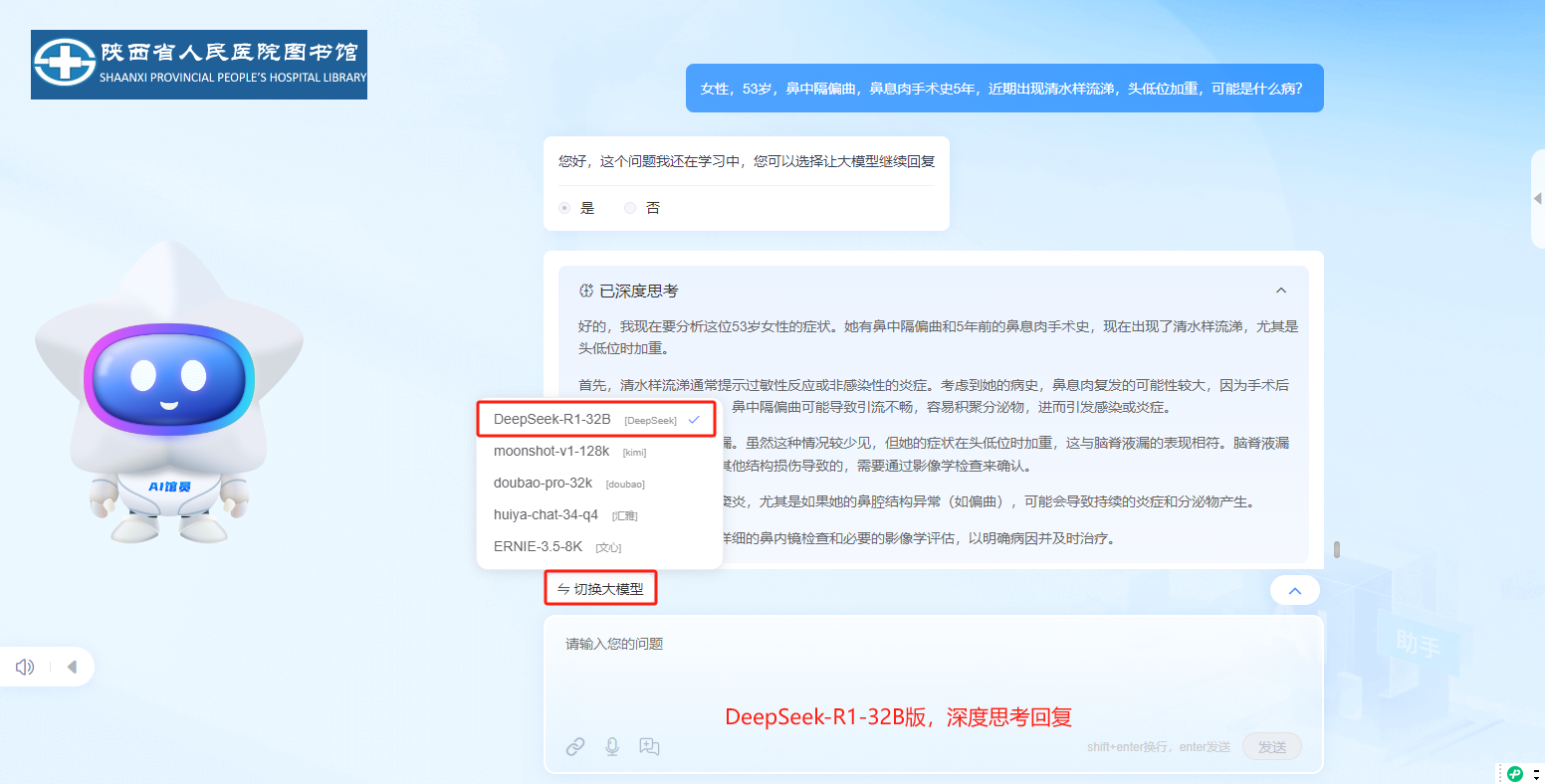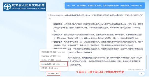1.接入五个大模型:可随意切换DeepSeek、Kimi、doubao、文心及汇雅电子书大模型进行快速问答,无论是医学知识、临床指南,还是科研支持,AI馆员都能提供权威、专业的解答,辅助临床决策,节省宝贵时间。