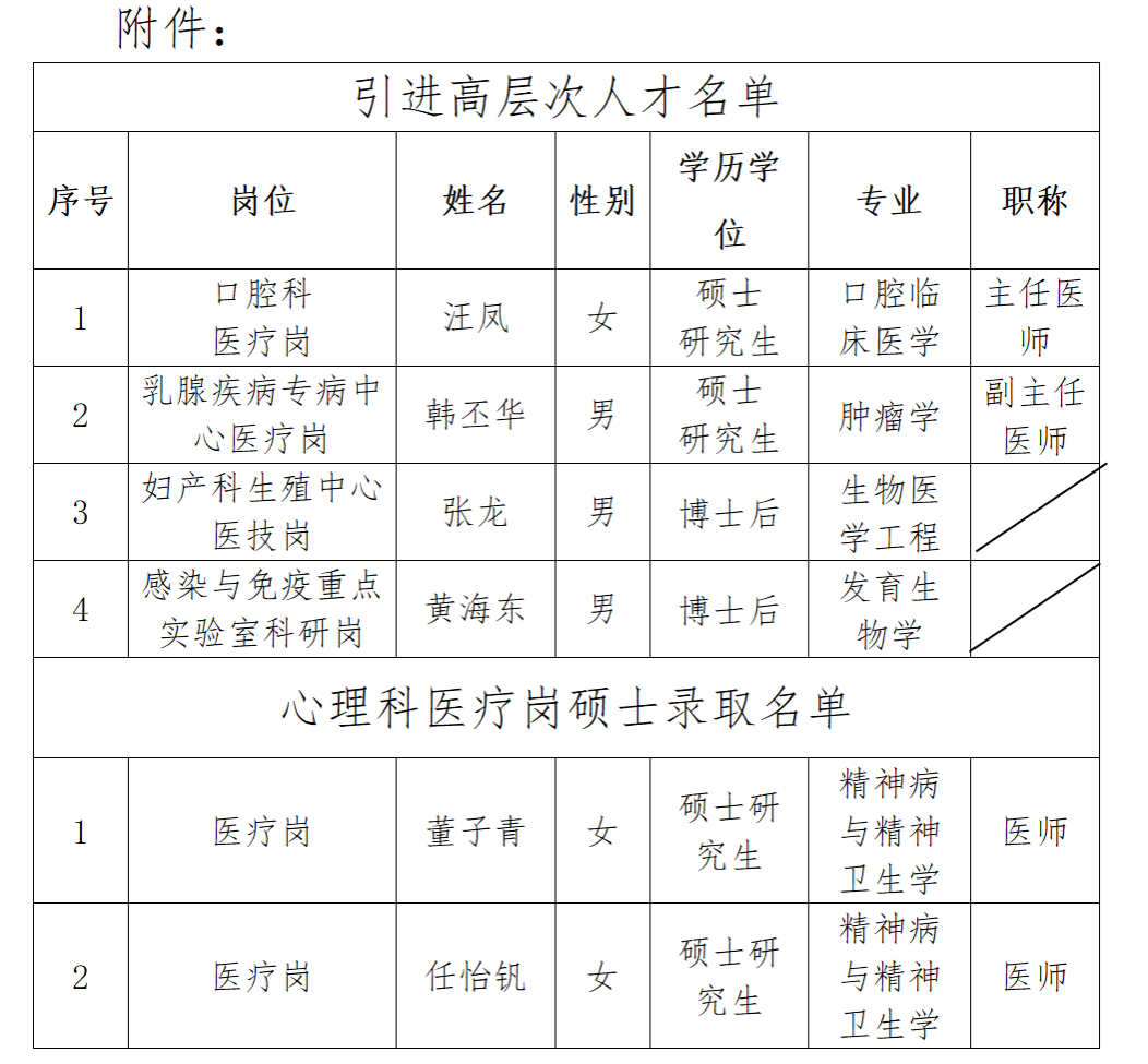 根据事业单位公开招聘工作有关规定,按照医院《2025年临床医技科室博硕士及高层次人才招聘公告》,结合医院学科和业务发展需要,经前期报名、资格审查、面试等程序,拟引进汪凤等高层次人才4人、心理科医疗岗硕士董子青等2人到六合彩网站工作。现予以公示。