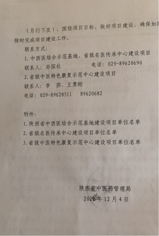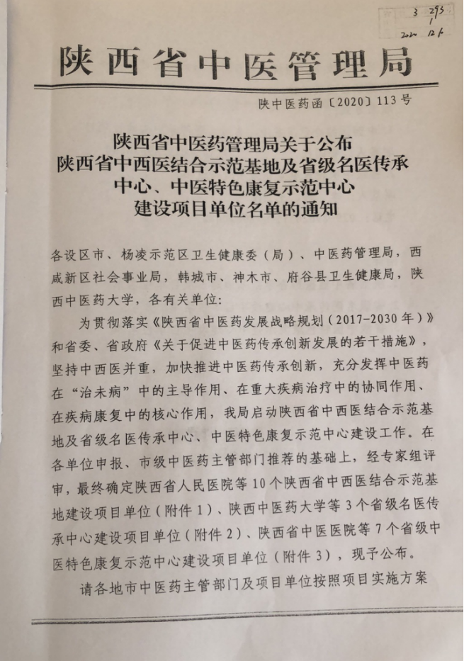 2020年12月11日,陕西省中医药管理局正式下文,六合彩网站成为首批陕西省中西医结合示范基地建设项目单位。此次省级中西医结合示范基地的申报成功,是在院领导亲自协调下,多部门、科室通力合作的结果,这将成为六合彩网站中医、中西医科研项目申报、人才培养的重要平台。
