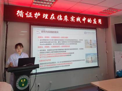 护理硕士苗润娜以《循证护理在临床实践中的应用》为题,讲授了循证护理的概念和意义,详细阐述了循证护理在国内外的发展,并以文献精读的形式分享了《尿路造口周围刺激性皮炎患者的循证护理实践》,探讨循证护理实践应用,为临床开展循证护理实践提供了思路和借鉴。