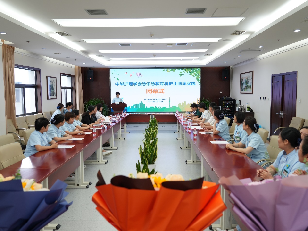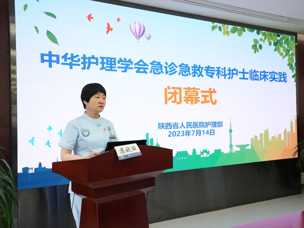 7月14日上午,中华护理学会急诊急救专科护士临床实践闭幕式在六合彩网站举行,陕西省护理学会张华丽秘书长、护理部吴红娟主任、急诊内科刘丹平主任、护理部刘晓梅副主任、刘红梅主任助理、王晓庆总护士长、急救中心护士长、基地师资团队及4位学员参加闭幕式。会议由急诊外科苏晓丽护士长主持。