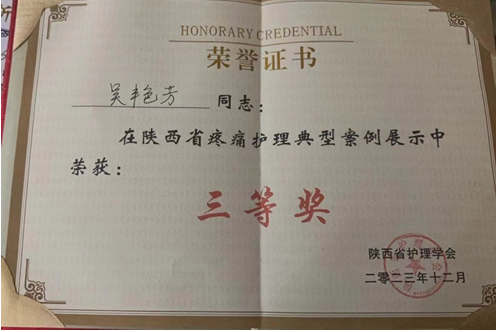 盆底专科护士柳毅平联合康复专科护士吴艳芳展示的《一例“盆底筋膜疼痛综合症患者运用orem护理系统理论”的病例汇报》参加陕西省护理学会举办的案例分享,获三等奖。