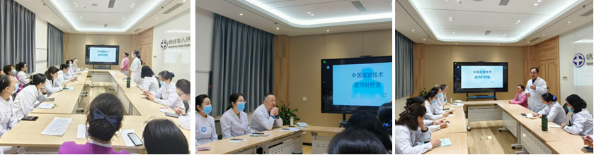 李婷护士长带来《皮内针疗法》专项培训,从概述、中医理论基础、现代作用机理、疗法特点进行讲解,分享了如何正确操作,包括穴位的正确选取方法和埋针注意事项。最后李静主任医师强调一定要注意禁忌症,确保能够安全施针,提高工作质量。同时大家针对热点问题进行热烈讨论。尚亮主任总结,要求注重医护一体化,认真学习中医护理技术,知其然知其所以然,提升诊疗护理服务水平,用专业服务患者。
