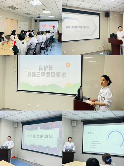 培训会上,介入放射诊疗手术室副护士长雷博结合专业知识和临床经验,带来了一堂生动的专业课。普外一科护士长肖海敏对三甲复审要求进行了详细解读。护士陈倩以“揿针的临床应用及推广”为主题,通过实例展示了揿针在临床上的独特疗效,激发了大家对传统中医护理技术的兴趣。副护士长付佳分享了微信推文的编辑技巧,护士陈曦以“创意视频编辑”为主题,讲解了视频编辑技巧。最后,科室五大质控组组长从文件管理、基础护理、病区管理、教学科研、消毒隔离五个方面,对科室的安全质量进行了全面而深入的分析。
