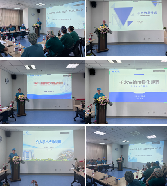 培训中做了《手术物品清点规范化管理》《PACU患者转出标准与流程》《手术室输血规范化管理》《介入手术室应急制度》专题授课。