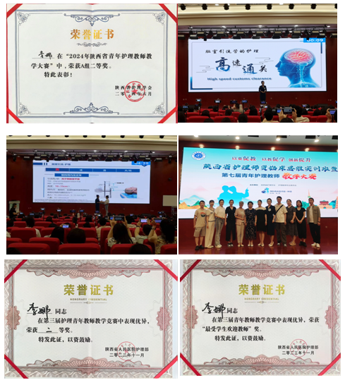 2024年5月经过省护理学会的再次筛选,6月李娜代表医院参加省青年护理教师教学大赛,被编入A组。A组选手共20名,均为来自空军军医大学、西安交通大学等院校及附属医院的优秀教师。面对压力大、对手实力强的情况,李娜在护理部郭花博士、神外专家杨彦龙、李帅等老师以及手术二部全体护理同仁的指导与支持下,反复打磨课件,文稿一改再改。最终功夫不负有心人,取得了二等奖的优异成绩。