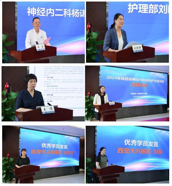 神经脑科病院杨谦副院长对学员们顺利结业表示祝贺,希望学员们继续秉承南丁格尔精神、艰苦奋斗、创新进取,为健康陕西、健康中国建设贡献力量。护理部刘晓梅副主任总结,强调了护理人员在大健康背景下应承担的重要责任,希望各位学员开拓创新,学以致用,加强交流,在各自的岗位上继续精进,发光发热,为患者健康谋取更多福祉。