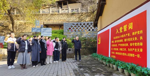 参观完后,在支部书记李文生的带领下,全体党员面对党旗,庄严地举起右拳,重温入党誓词。铿锵有力的誓言在圣地延安上空回荡,表达了大家为党的事业奋斗终身的坚定决心。