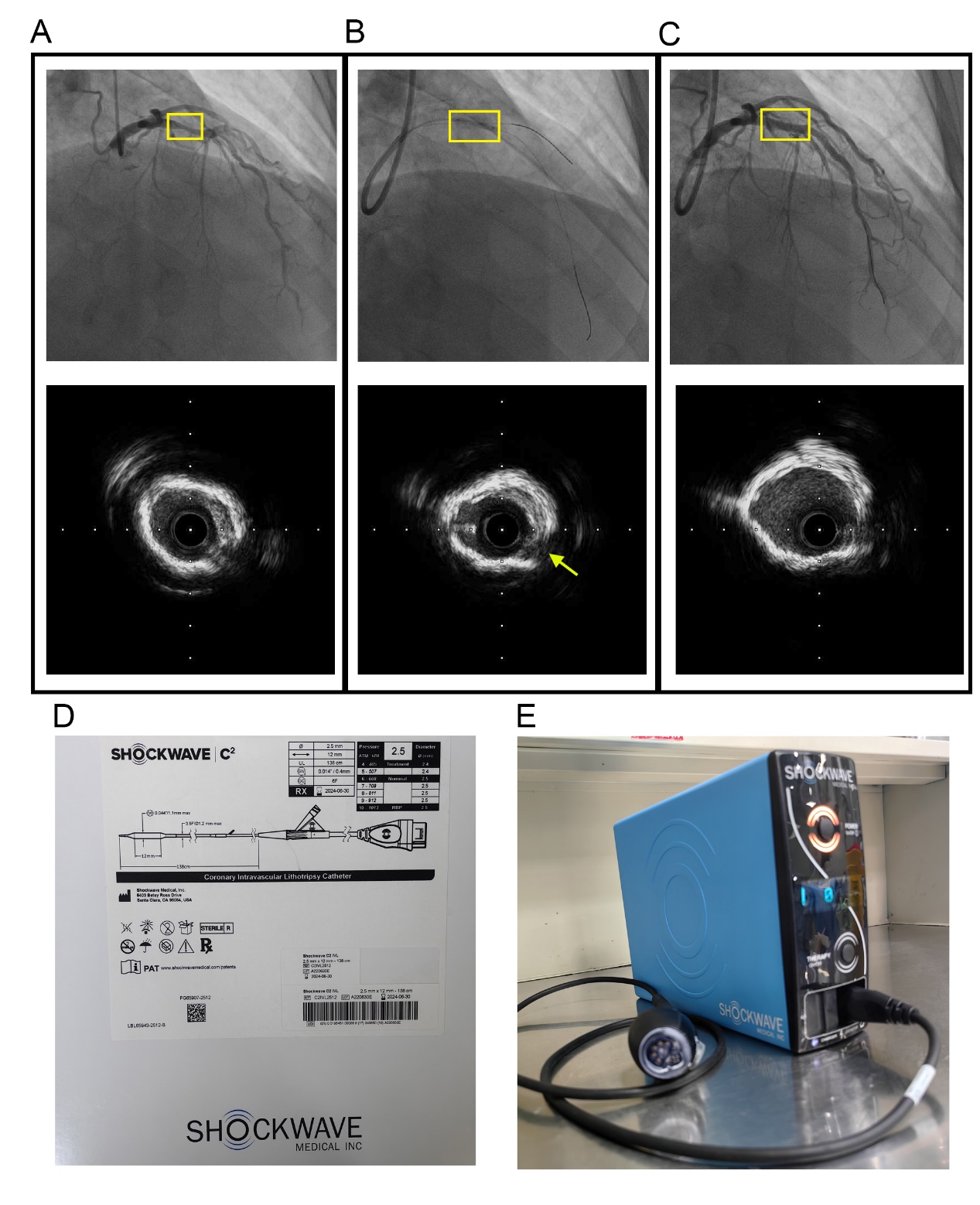 患者男性,68岁,因劳力型心绞痛入院。经充分的术前准备,患者接受PCI治疗。冠脉造影显示左前降支6段80%-90%狭窄,血管内超声(IVUS)显示内膜360°环形钙化,钙化环后方无声影,提示钙化病变厚(图A),常规预处理手段可能作用不佳。经介入团队讨论,使用冲击波球囊系统(图D及图E)对血管进行预处理。冲击波球囊发放20个脉冲,并进行6atm扩张,IVUS检查可见钙化环断裂(图B),达到预处理的预期目的。随后为患者植入支架,IVUS提示支架膨胀及贴壁满意(图C),手术成功。术后转入监护室,护理团队精心护理、密切观察,患者胸痛症状消失,目前已康复出院。