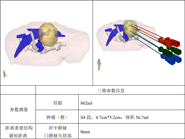 患者为67岁女性,1年余前诊断胃腺癌晚期,肝脏、骨骼及淋巴结多发转移,本次入院复查发现肝脏病灶进展,科主任白俊主任医师、主管医生刘莹主治医师详细分析并与患者家属沟通病情,考虑患者既往接受多线系统性抗肿瘤药物治疗,且治疗过程中多次出现剂量限制性骨髓毒性,继续更换药物治疗的选择空间不多,推荐超声引导下微波消融部分肝脏转移病灶,以期为后续继续免疫及靶向治疗创造在体瘤苗的机会。段宝军副主任医师认真阅片后,考虑该例患者肝转移病灶大(最大径超过5厘米),且毗邻膈肌、肝左静脉及第一肝门等重要结构,因此采用3D可视化手术规划系统设计微波消融方案,在麻醉科常建华副主任医师及手术室的精心配合下,顺利完成了肝转移病灶微波消融手术。