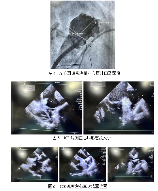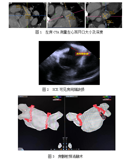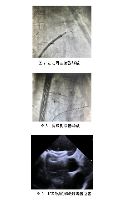 为最大程度降低卒中发生,避免房缺封堵术后行房颤射频消融术及左心耳封堵术的难度及不可操作性,决定房颤射频消融术后同期行房缺封堵术及左心耳封堵术(LAAC),以预防后期可能的风险及危害,从而选择“一箭三雕”的术式。为尽量减少患者创伤,提高患者体验感,缩短患者住院时间,经心电生理团队和结构性心脏病团队讨论,家属同意后,选择更加安全可靠的心腔内超声技术(ICE)引导局麻下行射频消融术+左心耳封堵术,并紧接进行房间隔缺损封堵术。