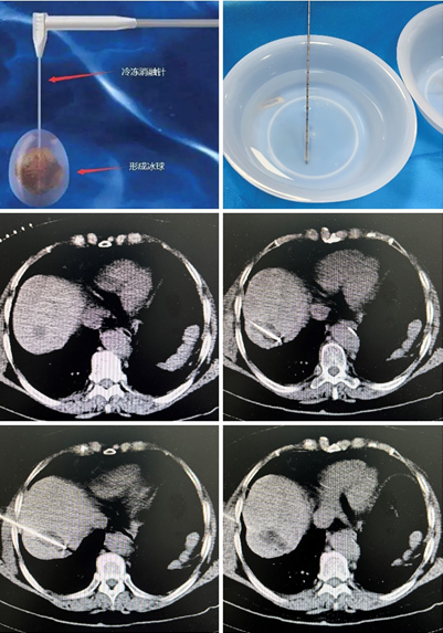 患者系老年女性,肝胆外科肝内胆管癌切除术后,近期查体发现肝脏新增肿瘤结节。在肝胆外科张智勇主任医师、常虎林副主任医师及介入科陈思攀医师共同讨论并与家属充分沟通后,最终选择了更微创、安全的“氩氦刀”冷冻消融治疗。整个治疗过程在CT室进行,通过病灶扫描、穿刺定位、冷冻消融、扫描复查等一系列过程,治疗团队顺利完成冷冻消融治疗,患者全程清醒,且无明显不适。从CT图像中清晰看出,冷冻消融针精准命中肿瘤结节,在消融针前端反复冷冻及复温的作用下,完全覆盖肿瘤区域,彻底“狙杀”肿瘤,达到预期治疗目标。