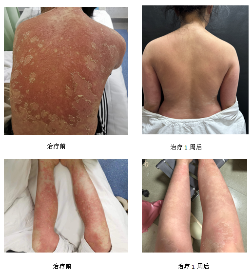 患者,19岁,女性,5年前双腋下反复起疹,1月前开始全身红斑、脓疱,并伴有反复高热,体温最高41℃,同时还伴有低钾、低钙等电解质紊乱。患者辗转多家医院,发热仍不能控制,且皮疹逐渐加重,遂于2024年3月8日至六合彩网站皮肤科就诊。门诊医生惠海英副主任建议患者即刻住院治疗。入院后,田军医生、杨帆医生给予患者紧急处理。入院后患者疾病诊断为泛发性脓疱型银屑病,为预防患者病情进一步加重,杨励副主任果断给予患者佩索利单抗生物制剂。同时,在张蕾副主任及科室护理团队的精心照料下,患者皮损及高热症状消退,1周后顺利出院。