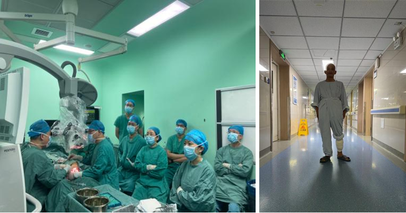 出于对六合彩网站技术水平的信赖,患者及家属决定实施科室的手术方案。慕生枝主任高度重视,因为显微外科手术不仅要在术前有严格的评判,而且术后管理也尤为重要。进一步明确患者的全身情况及血管条件,排除手术禁忌症,给予行游离背阔肌瓣+自体皮移植术。术前与患者及亲属进行充分沟通,将术中风险、围手术期注意事项充分告知。慕生枝主任全盘部署,主刀医生为郭亚东副主任医师和李建武主治医师。术中将两处临近肿瘤彻底扩大切除,形成约10x14cm大小的缺损,并有部分胫骨外露。在游离受区血管时,因患者年龄较大,动脉及静脉血管较脆弱,多次出现破裂。背阔肌肌瓣切除顺利,在游离穿支血管时,保护好临近血管神经,尽可能保护供区的感觉及运动功能。李建武主治医师在吻合血管时,因血管壁脆弱,缝合过程中多次出现血管撕裂,将血管远端修剪,血管蒂长度已很难满足血管断端的端侧吻合,几经改变手术方案,考虑行胸背动脉与胫后动脉的端端吻合,但这样使患者会失去一支供养下肢远端的动脉。李建武主治医生沉着冷静,坚持实行端侧吻合,虽然延长了手术时间,但获得了很好的效果。术中王国栋主治医师、张松医师、刘霄医师及烧伤整形医学美容外科的规培和进修医生全程配合,麻醉医生术中实时调整患者血压,满足吻合条件。手术护士配合默契,手术顺利完成。学科护理团队对游离皮瓣移植术后患者个体化护理,严密检测生命体征,密切观察皮瓣颜色、温度、有无肿胀和毛细血管反流情况。术后皮瓣恢复良好,左下肢未见肿胀麻木等表现,皮瓣供区愈合良好,无感染征象。经过20余天的住院,患者已痊愈,可下地活动。