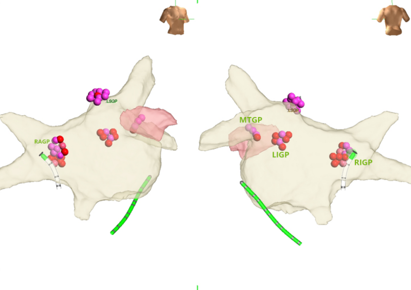 接受此手术的为27岁青年男性患者,以“头晕1天”主诉来院就诊。该患者长期从事高强度体育锻炼,入院后心电图显示窦性心动过缓、窦性停搏伴交界区逸搏,静息心率30-45次/分并伴有头晕,心电监护显示头晕与心动过缓呈对应关系。入院后完善24小时动态心电图示显著心动过缓,最慢心率31次/分。排除药物、冠脉病变、甲状腺功能减退、心肌炎等继发性心动过缓病因。结合患者病史及相关检查结果指向患者为高迷走反应所致严重功能性心动过缓。随后行直立倾斜试验:心脏抑制型阳性,最长停搏(RR间期)8.2秒,并诱发晕厥,明确为高迷走反射所致心动过缓。考虑到患者目前年龄仅27岁,如果按照传统方案行心脏永久起搏器植入术,患者后期仍需多次更换起搏器。可尝试进行心脏迷走神经节消融改良术调整心脏迷走神经张力,以期提升患者心率、改善患者症状、避免心脏永久起搏器植入。