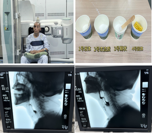 患者60岁,6月余前发生脑梗死并在多家医院进行对症治疗,目前患者仍遗留四肢欠灵活,进食频繁呛咳,吞咽困难,言语不能,留置鼻饲管。为进一步治疗,患者到六合彩网站神经内科(西咸)就诊。因患者有强烈进口进食诉求,神经内科遂请康复医学科会诊。康复医学科医生及治疗师团队结合患者病历、详细问诊及吞咽检查后,考虑患者存在吞咽障碍,为进一步明确诊断,在放射科马少君副主任的支持下,康复医学科为患者进行了吞咽造影检查。检查通过在X线透视下,动态观察患者在不同体位下,分次给患者喂食不同稠度、不同剂量的食物,观察患者在吞咽中的全过程。最终,在康复医学科(西咸)魏蓉康复治疗师、吉利华副护士长、张妮国家级吞咽专科护士,放射科马少君副主任,神经内科(西咸)李舒扬护士的通力协作下,检查顺利完成,并为患者制订了详细的治疗方案。