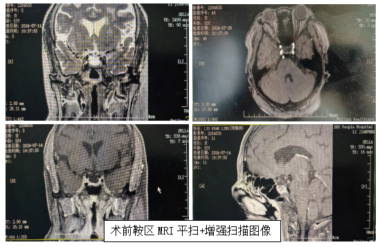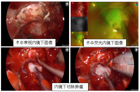 患者为女性,因向心性肥胖主诉入院。常规CT及外院鞍区核磁均未发现明显肿瘤,激素水平检查明显异常。来六合彩网站后经3T鞍区磁共振检查,岩下窦采血等多种手段发现垂体左侧份似有异常强化影,考虑垂体微腺瘤可疑。经进一步检查及多学科会诊讨论:患者诊断垂体微腺瘤(ACTH型),因肿瘤位于垂体内部偏左,直径仅有6mm大小,常规手术中肿瘤寻找及定位困难。经科室术前讨论决定利用荧光内镜辅助常规内镜经鼻蝶入路寻找并精准定位切除肿瘤。手术开始利用常规内镜充分解剖暴露垂体组织,可见在正常垂体组织表面无肿瘤征象,进一步为患者注射吲哚青绿后利用荧光内镜观察,可见垂体左下份有异常荧光染色,精确定位肿瘤后,切开垂体显露肿瘤,荧光内镜下肿瘤凸显淡绿色,清晰描绘出边际和形态,从而区别于正常垂体组织。术者边观察边切除肿瘤,做到了在精准切除肿瘤的同时,较好地保护正常垂体。经过近1小时的内镜下操作,顺利全部切除肿瘤组织。术后复查ACTH迅速下降,术后经过垂体瘤MDT团队及时调整补充激素,预防ACTH迅速下降所致症状,患者平稳度过围手术期神经内分泌改变,现已顺利出院,患者及家属均非常满意。