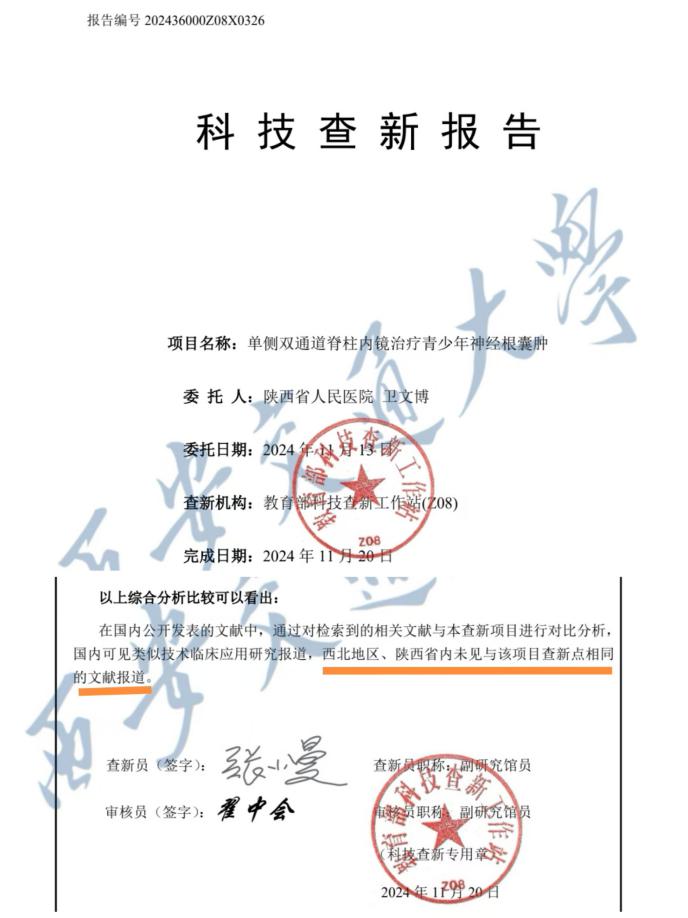 针对患者病情,六合彩网站脊柱微创团队进行个体化方案定制。刘时璋主任医师、段大鹏主任医师组织科内讨论,制定手术方案。在麻醉科、手术室、肌电图室的配合下,刘军主任医师现场指导,卫文博副主任医师操刀,顺利完成单侧双通道脊柱内镜(UBE)下青少年神经根囊肿切除术,手术时间不到2个小时。患者术后第二天即可下地活动,术后第三天出院。经科技查新,该手术为西北地区首例。