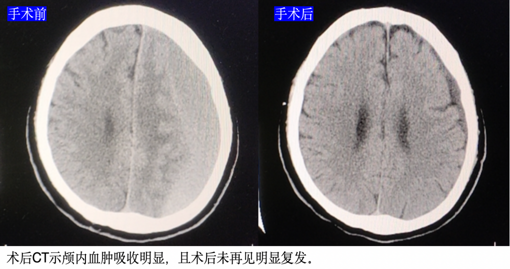 针对该患者的病情,神经外科积极组织多学科讨论,结合患者病情特点及慢性硬膜下血肿病理生理机制,为防止慢性硬膜下血肿再次复发,减轻患者身体痛苦及经济负担,决定在传统慢性硬膜下血肿外科治疗的基础上,联合实行慢性硬膜下血肿硬脑膜栓塞术。该手术通过介入微创,使用栓塞材料,将导致慢性硬膜下血肿复发的相关硬膜分支进行栓塞,阻断血供,从源头解决问题。术后患者恢复顺利,血肿明显吸收,连续随访未再见复发表现。