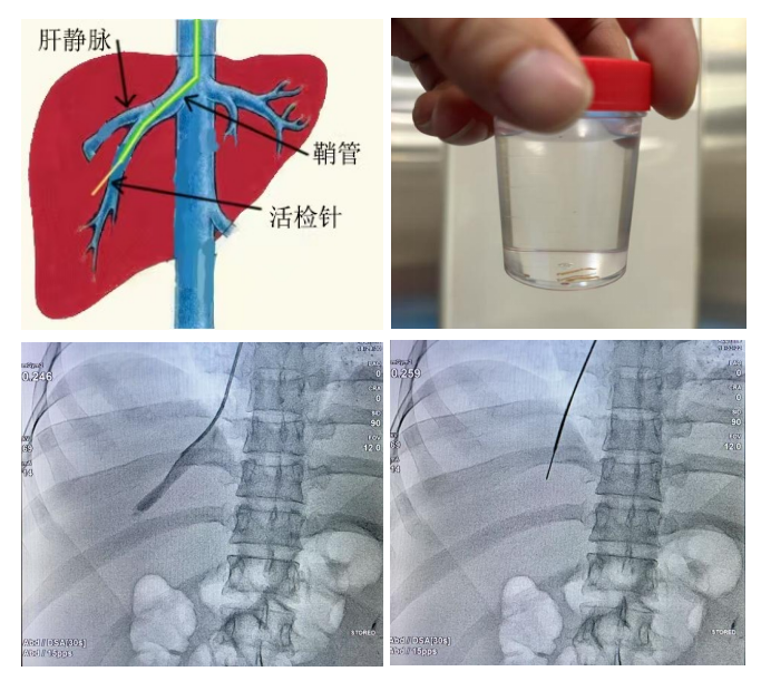患者为年轻男性,因不明原因反复大量腹水入院,多种途径排查仍未明确病因,考虑行肝脏穿刺活检进一步明确病因。对于该患者来说,传统经皮肝穿刺活检术存在相对较高出血风险,消化内一科刘贵生主任、金燕副主任医师与微创介入科团队共同评估沟通后,决定采用经颈静脉入路进行肝穿刺活检(TJLB),以争取进一步明确诊断及后续治疗。微创介入科手术团队在DSA(数字减影血管造影)引导下,经患者颈静脉穿刺建立通路,精准抵达肝中静脉,利用专用活检针顺利获取肝组织样本。过程用时约20分钟,术中患者生命体征平稳,术后安返病房。