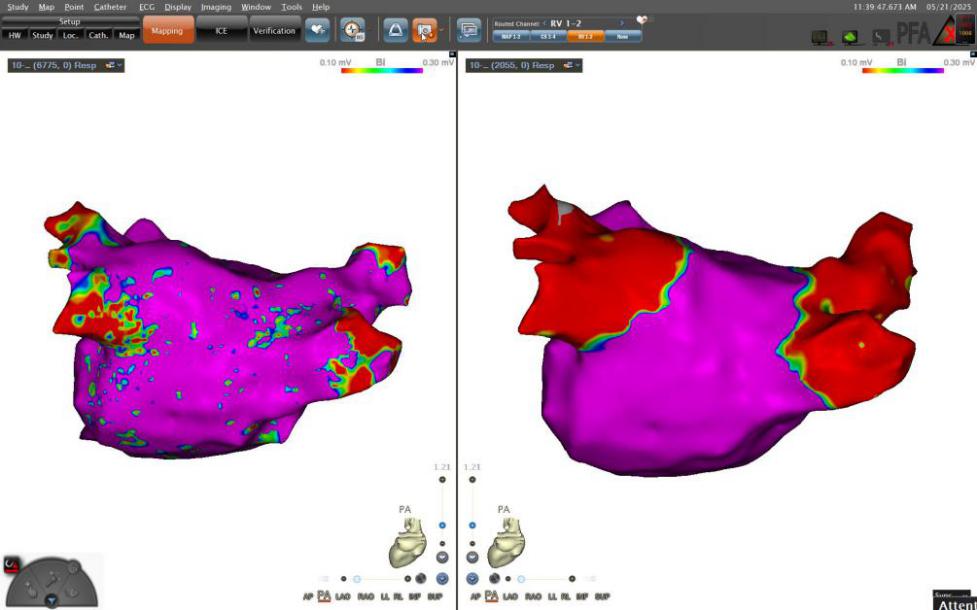 本次接受治疗的患者为53岁男性,罹患持续性房颤长达7年,经多学科联合评估后,团队决定采用创新的脉冲消融技术。手术中,麻醉科岳芳医师实施个体化全麻管理,介入手术室任超技师与护理团队紧密协作,心内二科电生理团队依托心腔内超声(ICE)引导,借助CARTO 3系统构建出毫米级精度的左心房三维模型,精准锁定肺静脉异常电位区域。VARIPULSE导管通过28次微秒级高能电脉冲释放,以单支肺静脉12分钟的隔离速度完成治疗,整台手术耗时较传统射频消融缩短71%,术中患者生命体征平稳,术后即刻显示肺静脉电位完全消失,达到国际诊疗标准。