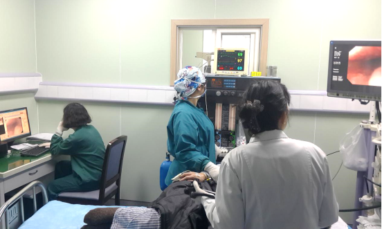 无痛支气管镜检的过程大致分为麻醉诱导、支气管镜检查、麻醉苏醒三个阶段。麻醉诱导就是患者从清醒转为睡眠的过程,一般入睡后医生会给患者嘴里放一个通气用的喉罩;检查时这个喉罩既是支气管镜进入的通道,又是肺内气体交换的窗口,所以这个通道非常重要;检查结束后,患者会在安静的环境里继续休息,直至自然苏醒。检查治疗过程中,麻醉医生与检查医生密切配合、反复沟通,既要保证检查顺利进行,又要保证患者的通气,承担了很大一部分的风险,可以说为了减轻患者的痛苦,操碎了心。
