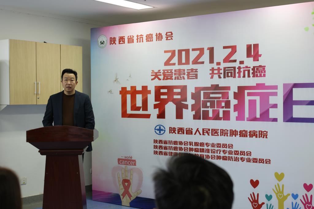 院长、陕西省抗癌协会理事长宋张俊教授致辞并宣布启动2021世界癌症日科普宣传系列活动,肿瘤病院常务副院长、肿瘤外科李建辉主任,肿瘤病院副院长、放疗科王青主任和肿瘤内科白俊主任分别致辞,随后,宋张俊院长、张玉莲副院长分别为肿瘤病院“陕西省乳腺疾病临床医学研究中心”和肿瘤外科“陕西省青年文明号”授牌。