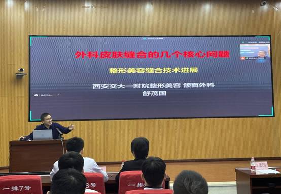 舒茂国教授做了题目为《外科皮肤缝合的几个核心问题---整形美容缝合技术进展》的培训,从皮肤缝合、医源性瘢痕、美容缝合概念、蜈蚣瘢痕的形成等基本内容为切入点引出外科皮肤缝合的核心问题,结合自身实践经历,针对相关核心问题做了一一解答。随后,慕生枝副主任做了题目为《工欲善其事,必先利其器—美容缝合材料的选择》的培训,从缝线基础知识、不同材料缝线特点、医用缝合针分类三个方面详细讲授了美容缝合材料的选择。