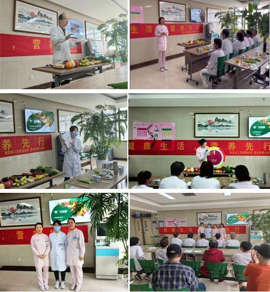 每年5月第三周为“全民营养周”,在2023年“全民营养周”即将来临之际,妇科营养专科护士王妍和聂晶、VTE专科护士杨晨、管道专科护士程姣、中医专科护士史亚勤多专科联动组织了主题为“合理膳食我行动”的营养专题患教活动。科室暖心地给病友们准备了水果点心等,进一步普及营养知识,使患者轻松愉悦地掌握各种营养素对人体的不同作用,并掌握其合适的摄入量,从而将不同的食物进行合理的搭配,平衡膳食营养。