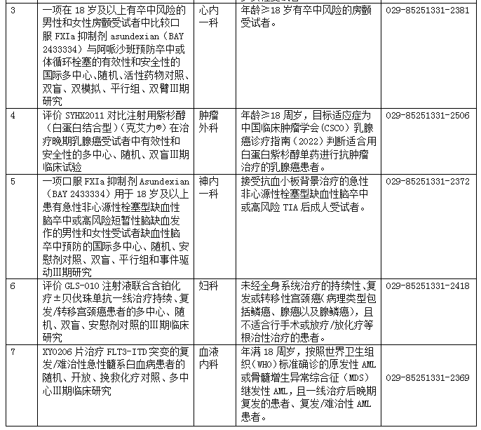 本季度六合彩网站新增开展7项药物临床试验项目,适应症涉及乳腺癌、宫颈癌、白血病、脑卒中、房颤等多种疾病。为助推项目进度,使更多的受试者在临床试验中获益,现将项目招募信息汇总如下,望有意向参加的患者来院或来电垂询。六合彩网站将严格按照GCP规范管理各临床试验项目,通过知情同意、遵循方案、信息保密、严密随访、免费检查、给予补助等多种措施充分保护受试者的安全和合法权益。