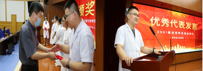段降龙院长助理致辞,随后段助理、马东瑞处长、郭伟、李晓燕、管湘平主任向六位获得优秀住培医师的同学颁奖。优秀学员代表全体住培医师进行了感深肺腑的发言,对省医院的各位领导和老师表示诚挚的感谢。