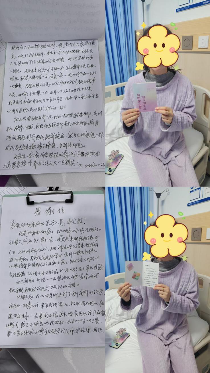 患者在住院期间,体验了丰富多样的治疗方法。除了常规的药物治疗和物理治疗外,还提供了个体心理治疗、家庭治疗、团体心理治疗,以及八段锦、正念练习等一系列精神康复活动。晚饭后,值班人员组织患者及家属进行电影赏析和阅读分享,这些活动让大家在分享中感受到了彼此的支持和鼓励。在医、护及治疗师团队的精心治疗和护理下,患者的症状得到了显著缓解,生活质量也有了明显提升。患者良好的就医体验一方面源于张天布主任多年来带领大家取得的心理治疗方面的特色,另一方面源于在孙彦主任、胡静副主任以及惠珂护士长的统筹安排下,全科医、护、治疗师体现出的协作和专业精神。出院时,一张由护士长亲笔书写的贺卡、一句温暖的祝福、一张灿烂的笑容,以及患者亲笔写下的感谢信成了医患之间的纽带、桥梁和祝福,也是对心身医学团队工作的最大认可和鼓励。
