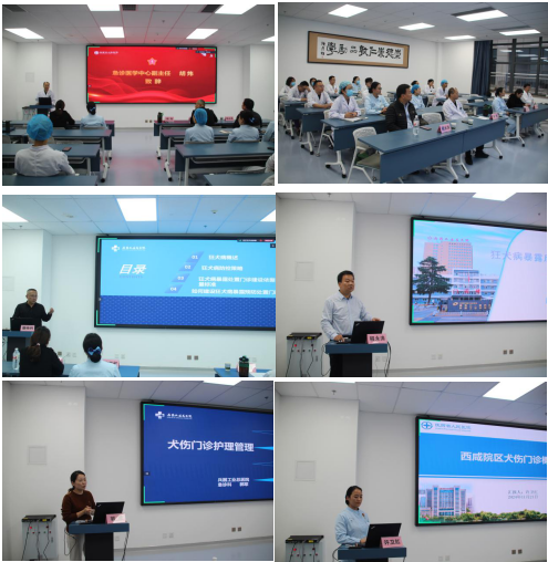 开诊仪式上,急诊医学中心胡炜副主任表示科室将不断提高犬伤处置的效率和专业性,优化就诊流程,确保患者得到及时高效的救治。许卫红副护士长介绍了目前西咸院区犬伤门诊及运作模式和接诊流程。开诊仪式上同时邀请兵器工业总医院唐映利主任团队的专家进行授课,内容涵盖了犬伤门诊的建设与管理、狂犬病暴露规范化处置流程、犬伤门诊护理管理等多个方面。