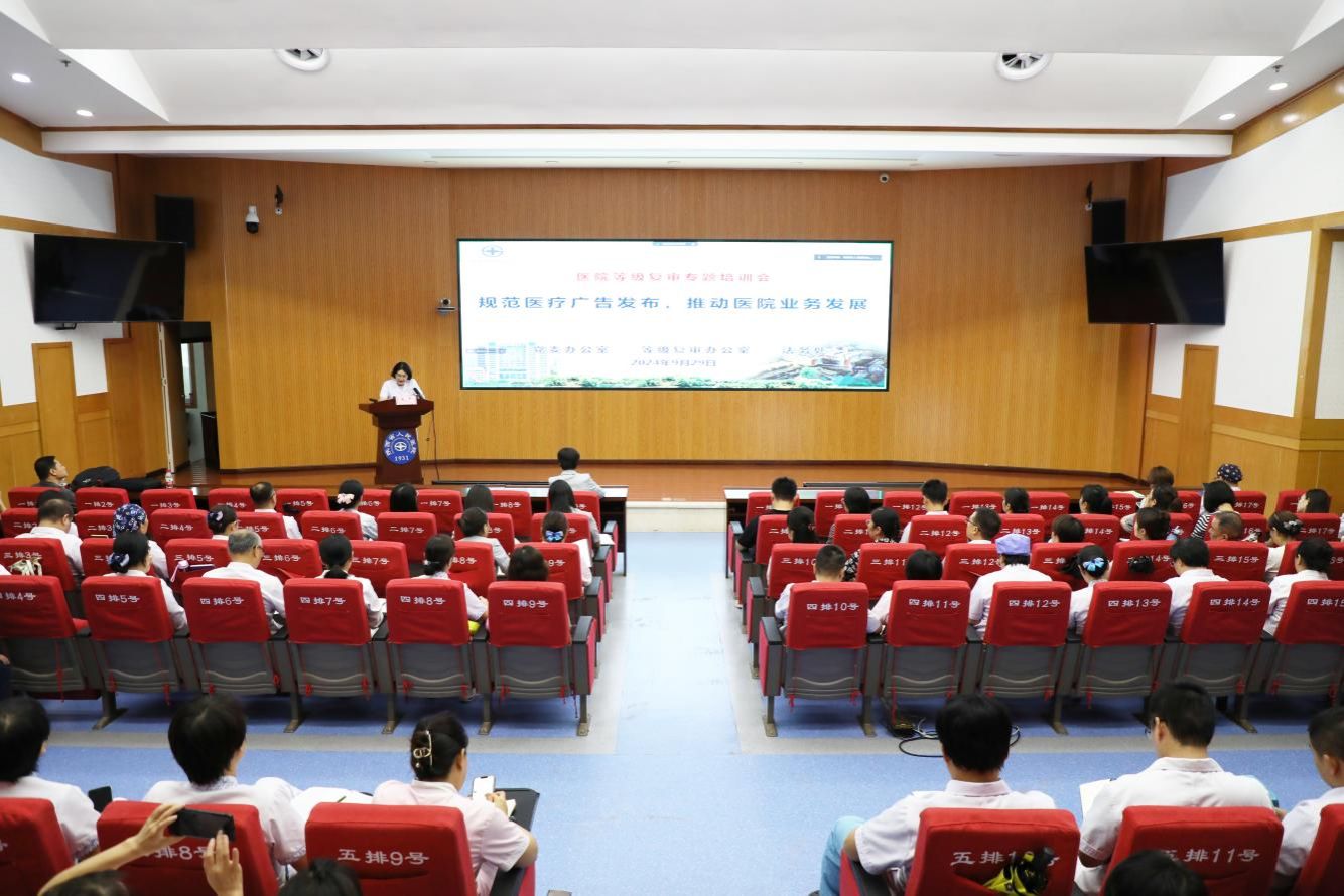 为积极响应等级复审评审要求,进一步规范医疗广告发布,2024年9月29日下午,党委办公室与等级评审办联合举办“规范医疗广告发布,推动医院业务发展”专题培训。此次培训邀请中国广告协会法律道德咨询委员会委员、西安市市场监督管理局双生分局商标广告科科长田军授课培训。临床科室主任、护士长及部分行政管理部门负责人120余人参加了培训。